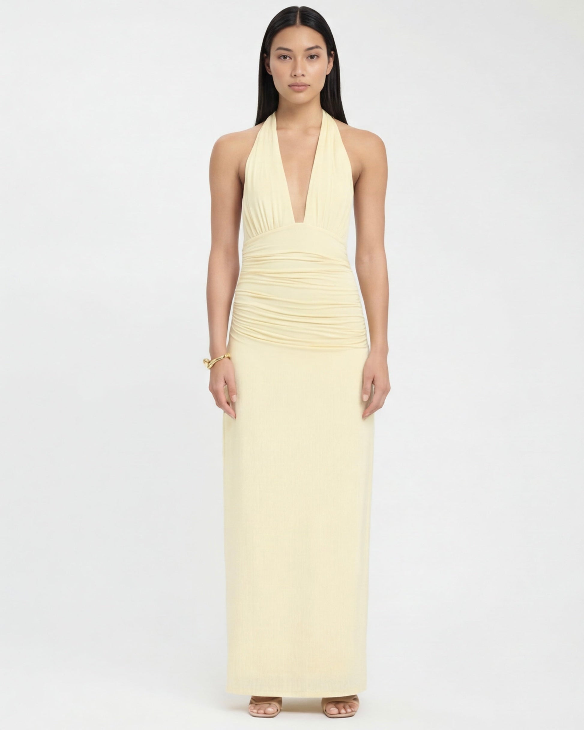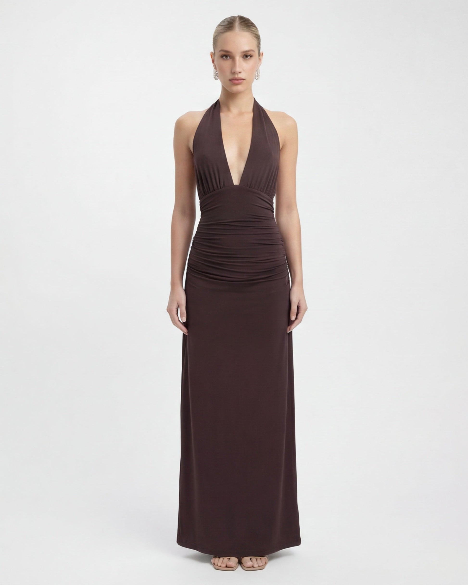 ✔ Escote halter profundo y estilizador ✔ Espalda abierta con ajuste adaptable ✔ Fruncido que realza las curvas con discreción ✔ Largo maxi atemporal ✔ Perfecto para cenas elegantes y eventos nocturnos